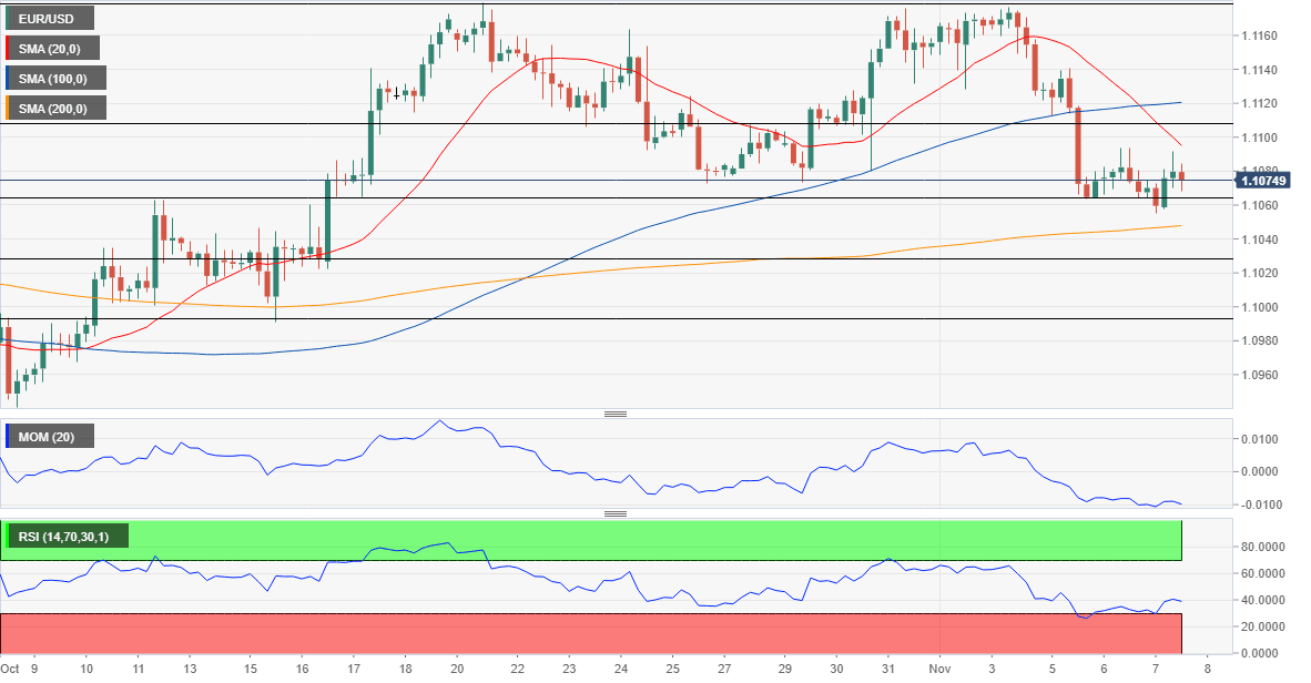 The EUR/USD is trading around 1.1075, barely holding above a major Fibonacci support, the 38.2% retracement of its October rally. In the 4-hour chart, the 20 SMA has extended its slide, retaining its bearish slope after crossing below the 100 SMA. Technical indicators remain within negative levels, although lacking directional strength, as the pair trade within familiar levels. Nevertheless, the risk is skewed to the downside, with renewed selling interest below the 1.1060 price zone probably triggering a slide to lower lows.
