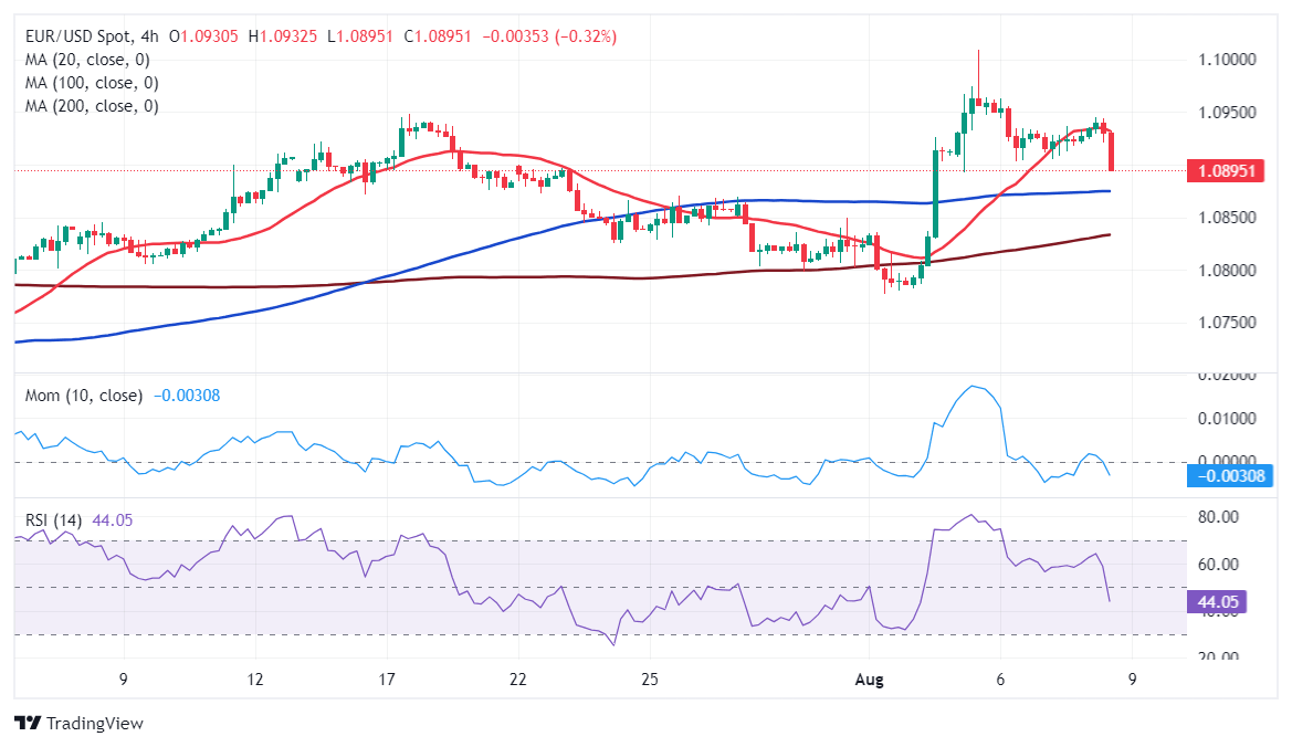 - EUR/USD turns bearish in the near term, aims to extend its slide.