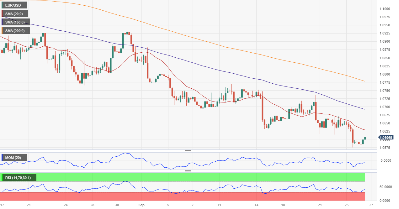 The EUR/USD pair fell to 1.0569 on Tuesday as concerns about continuously tight financial conditions weigh on economic expectations. The US Dollar benefited from the sour sentiment, as stock markets kept giving up yearly gains while government bond yields flirted with record highs. Other than that, speculative interest awaits inflation-related figures from major economies to confirm or deny its concerns.