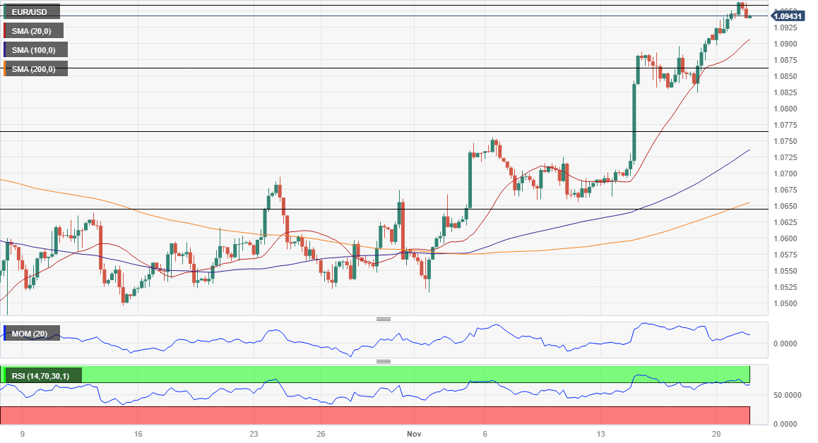 From a technical perspective, the daily chart indicates that EUR/USD is overbought but still bullish. Technical indicators aim north with uneven strength, standing at fresh multi-week highs. At the same time, the pair develops well above directionless 100 and 200 Simple Moving Averages (SMAs), standing around the 1.0800 level, while the 20 SMA keeps firming north below the longer ones.
