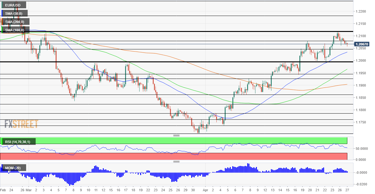 Euro/dollar continues benefiting from upside momentum on the four-hour chart while the Relative Strength Index (RSI) has drifted away from 70 – thus outside overbought territory. The currency pair continues trading above the 50, 100 and 200 Simple Moving Averages.