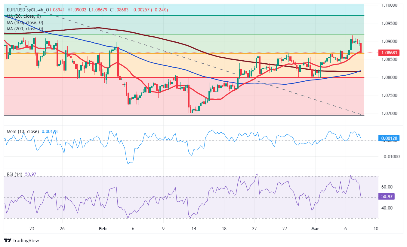The EUR/USD pair peaked at 1.0915 on Wednesday, its highest in six weeks, as the US Dollar lost ground following comments from Federal Reserve (Fed) Chairman Jerome Powell. Powell testified about the Semi-Annual Monetary Policy Report before the House Financial Services Committee and commented on monetary policy. Pretty much he repeated the well-known message of maintaining rates higher for longer, adding future decisions will depend on data. He also reiterated that the policy rate is likely at its peak and that policymakers considered it appropriate to dial back the monetary policy “at some point this year.” Chair Powell will testify again on Thursday, although before a different commission.