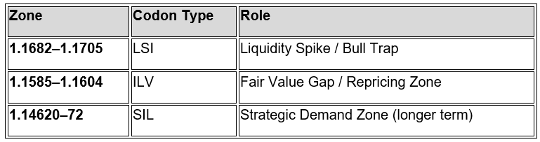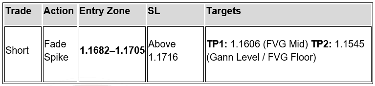 - Upper liquidity resting at 1.1682–1.1705, ideal for a Judas Swing and stop run.