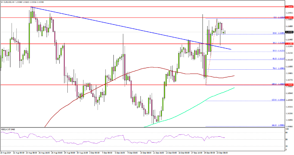 - EUR/USD started a fresh increase above the 1.1120 resistance.