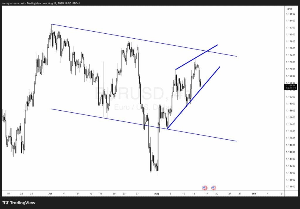 However, the bigger picture tells a more bullish story. EUR/USD is still trading within a larger descending channel, stretching back to early July. If the current wedge resolves lower and finds support, this could simply be a healthy correction within a broader trend reversal setup.