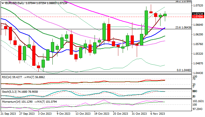 Holding above 1.07 is seen as a minimum requirement to keep bulls in play but break of upper pivots at 1.0764/1.0800 (Fibo 38.2% of 1.1275/1.0483 downtrend / daily cloud top / 200DMA) is needed to generate signal of bullish continuation and open way for extension of larger recovery leg from 1.0448 (Oct 3 low).
