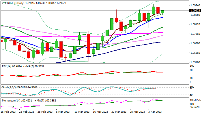 Overall picture remains bullish as the single currency benefited from weaker dollar, after downbeat US data pointed to cooling labor market and growing fears of recession risk, with immediate bullish bias to remain intact as long as the price stays above rising 10DMA (1.0865).