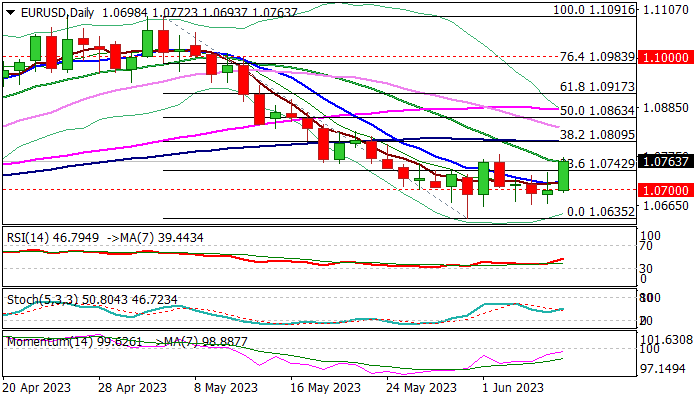 Daily close above broken Fibo 23.6% barrier at 1.0742 is seen as minimum requirement to keep fresh bulls in play.