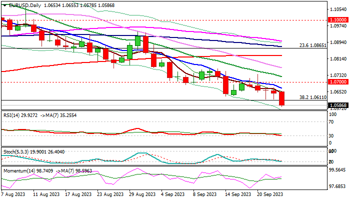 EURUSD came under renewed pressure in mid-European / early US trading on Monday and broke through pivotal support at 1.0611(Fibo 38.2% of 0.9535/1.1275 rally), after bears were repeatedly rejected last Thu/Fri.