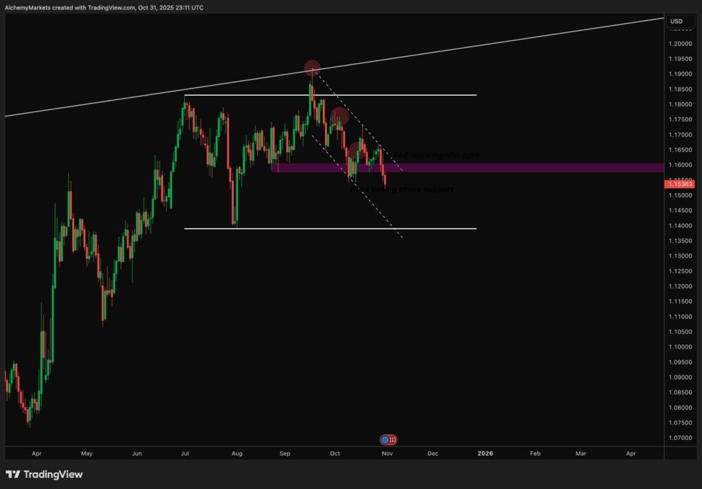 From a chart perspective, EUR/USD has broken beneath 1.1600, confirming a downside continuation within a short-term descending channel. Price action shows a sequence of lower highs and lower lows, reinforcing a bearish structure.