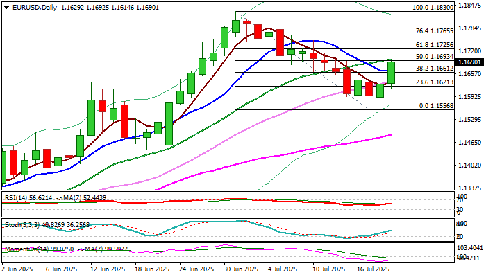 EURUSD regained traction and extended recovery on Monday, signaling formation of higher base at 1.1560 zone) and generating initial signal that correction from new 2025 peak (1.1830, posted on July 1) might be over.