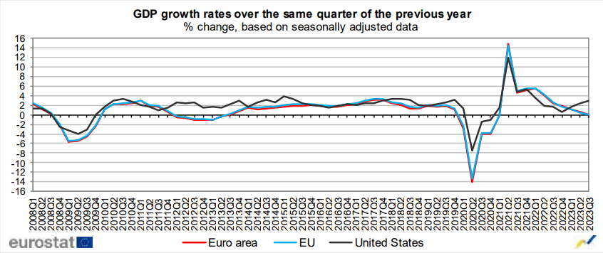 Compared with the same quarter of the previous year, seasonally adjusted GDP increased by 0.1% both in the Euro Area and in the EU in the third quarter of 2023, after +0.5% in the Euro Area and +0.4% in the EU in the previous quarter.