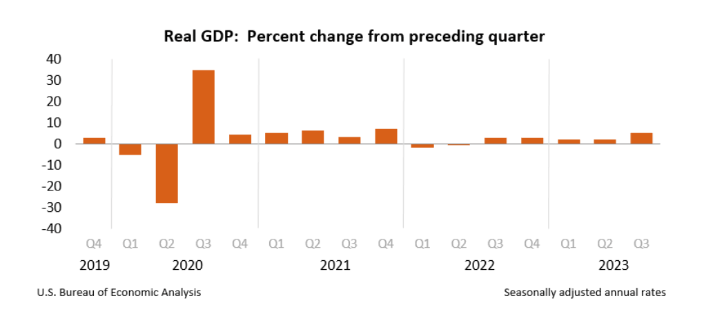 In the US, Real GDP increased at an annual rate of 4.9% in the third quarter of 2023, according to the Bureau of Economic Analysis (BEA). In the second quarter, real GDP increased 2.1%. The increase in the third quarter primarily reflected increases in consumer spending and inventory investment.