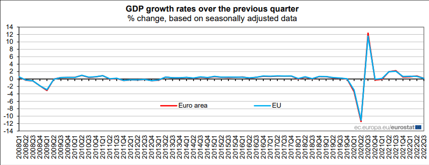 In the Euro Area, seasonally adjusted Gross Domestic Product increased by 0.3% compared to the previous quarter, according to Eurostat. In the second quarter of 2022, the GDP had grown by 0.8%, which followed a modest 0.6% uptick in the previous quarter.