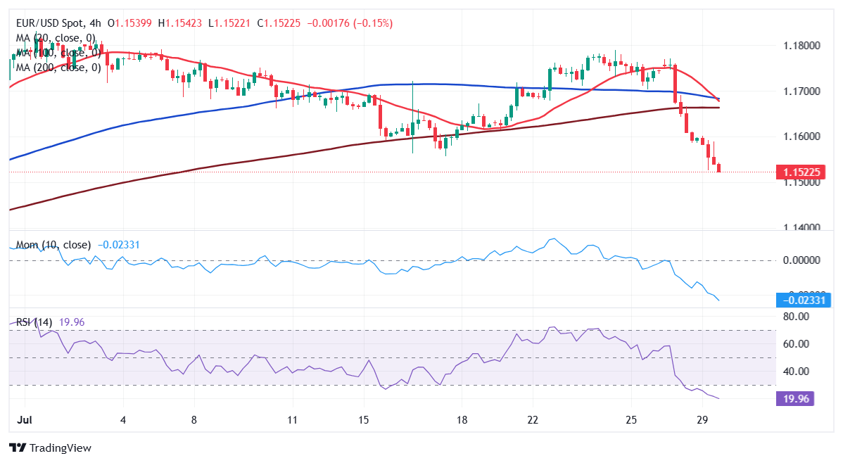 The EUR/USD pair fell to the 1.1520 region on Tuesday, pressuring the lows early in the American session, as the US Dollar (USD) retains its strong momentum across the FX board. The Greenback found its footing at the beginning of the week on the back of trade-deal announcements, particularly between the United States (US) and the European Union (EU), which seems more of a capitulation of the EU rather than a deal. The US also report continued talks with China, although a deal is not in the foreseeable future between the two rivals.