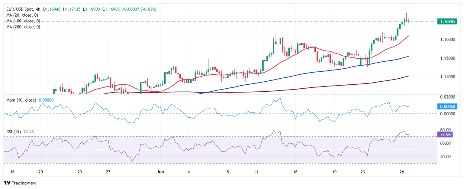 The EUR/USD pair peaked at 1.1741 during European trading hours, its highest since September 2021. It currently hovers around the 1.1700 mark, and the daily chart shows the bullish potential remains intact as the pair advances for the sixth consecutive day. Technical indicators aim firmly north, with the Relative Strength Index (RSI) indicator entering overbought territory without signs of upward exhaustion. At the same time, moving averages remain far below the current level and are heading higher, reflecting buyers' dominance. The 20 Simple Moving Average (SMA) currently stands at around 1.1500.