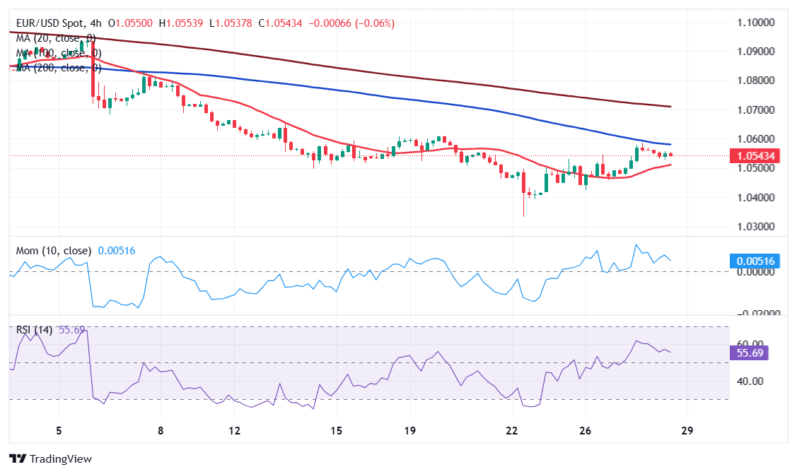 The EUR/USD pair hovers around 1.0540 on Thursday, not far below its daily opening and confined to a tight trading range. The pair peaked at 1.0587 on Thursday, as the US Dollar shed ground following mixed United States (US) data, anyway showing the economic resilience of the world’s largest economy.
