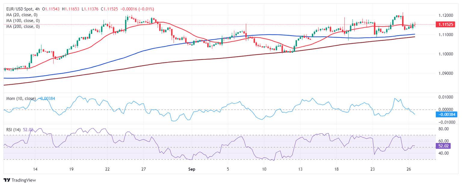 The EUR/USD pair managed to trim part of its Wednesday’s losses and trades around the 1.1150 mid-European session as investors await Federal Reserve (Fed) officials´ words. Multiple United States (US) policymakers are due to participate in the Treasury Market Conference in New York and could hint at what they are thinking ahead of the November meeting. It is worth remembering speculative interest has recently lifted bets of a 50 basis points (bps) rate cut.
