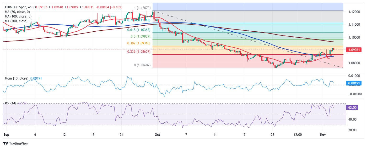 The EUR/USD pair advances above the 1.0900 mark on Monday, trading at levels that were last seen in mid-October. The US Dollar retreats ahead of the first-tier events in the United States (US) this week. The country will choose the next President this week, with results expected early on Wednesday. Afterward, the Federal Reserve (Fed) will meet to decide on monetary policy, with the announcement scheduled for Thursday.