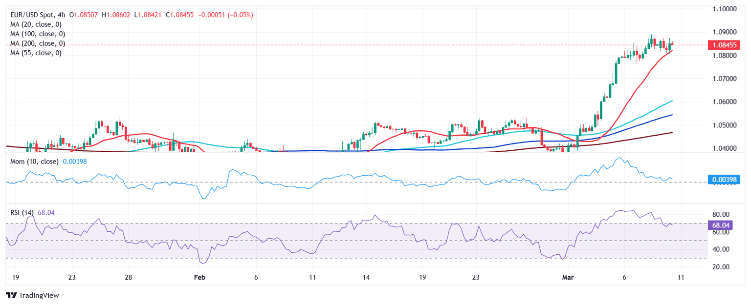 The near-term picture shows the risk remains skewed to the upside. The 4-hour chart shows a bullish 20 SMA provides intraday support at 1.0805, also the intraday low. Technical indicators have corrected extreme overbought conditions and turned flat, reflecting the ongoing consolidative phase while maintaining the risk skewed to the upside.
