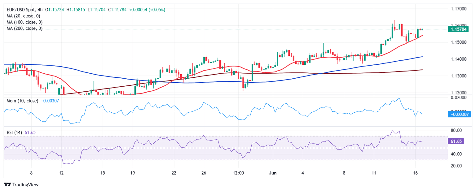The EUR/USD pair advances on Monday, approaching the 1.1600 threshold early in the American session. The US Dollar (USD) started the week with a firmer tone, gaping higher against most major rivals, amid the Middle East conflict. Iran and Israel kept exchanging airstrikes throughout the weekend, with civil casualties accumulating on both sides.