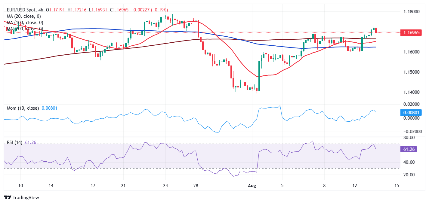 The EUR/USD pair extends its positive momentum on Wednesday and hit a fresh two-week high of 1.1719 during European trading hours. Market players keep selling the US Dollar (USD) amid a better mood triggered by the release of the United States (US) Consumer Price Index (CPI). Inflation, as measured by the index, rose 2.7% in the year to July, while the core annual reading printed at 3.1%. Despite being above the Federal Reserve’s (Fed) goal, the figures are well below feared.