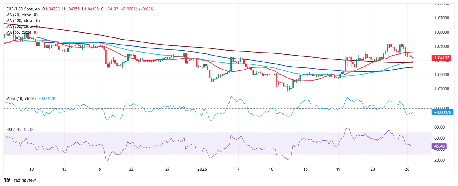 The EUR/USD pair is in retreat mode on Tuesday, easing from the weekly peak in the 1.0530 region over 100 pips and heading into the American session, opening trading a handful of pips above the 1.0400 mark. The US Dollar (USD) surged on renewed tariff-related concerns.