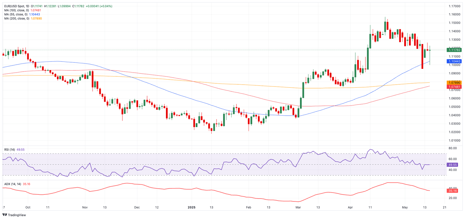 Support levels to watch include the May low at 1.1064 (May 12), followed by the temporary 55-day SMA at 1.1055 and the key 200-day SMA at 1.0796.