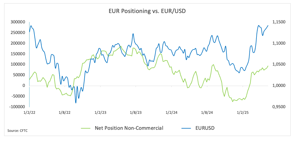 According to CFTC data as of June 10, open interest in EUR rose to nearly 810K contracts, the highest level in several years, and net long positions increased to over 93K contracts, the highest since early September 2024. Commercial hedgers increased their short exposure to about 151.3K contracts, indicating institutional demand for euro downside protection.
