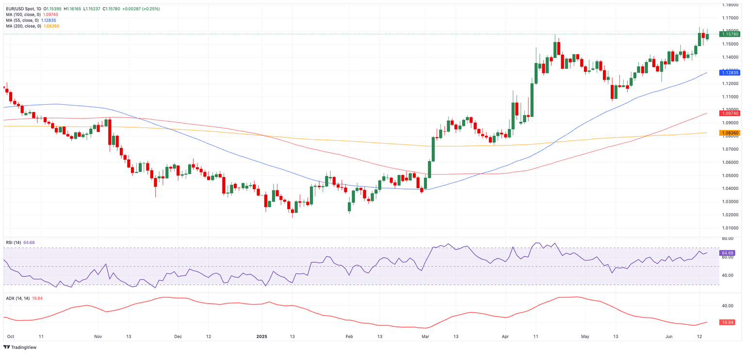 EUR/USD faces immediate resistance at its 2025 peak of 1.1631 (June 12), prior to the October 2021 high of 1.1692, and the round level at 1.1700.
