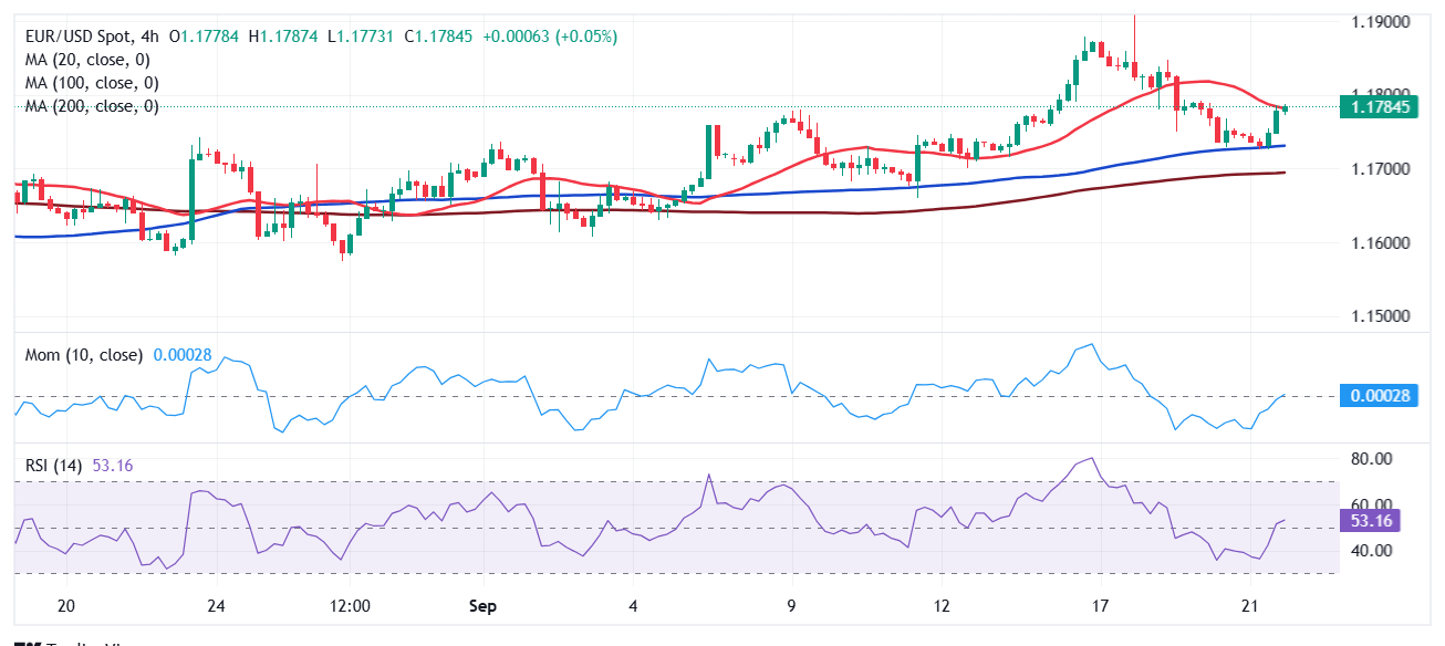 In the near term, and according to the 4-hour chart, the intraday recovery from early lows is not enough to confirm additional EUR/USD gains. The recovery stalled just ahead of a bearish 20 SMA, while technical indicators aim higher, yet remain within negative levels. The 100 SMA provided intraday support, now standing at around 1.1725, reinforcing the relevance of the support area.