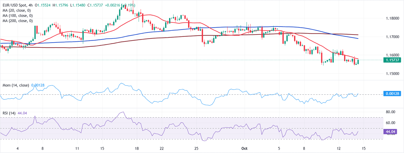 The 4-hour chart shows that a bearish 20 SMA caps the upside for the EUR/USD pair, currently at around 1.1590. At the same time, a bearish 100 SMA is crossing below a flat 200 SMA, both far above the current level and supporting the bearish trend. Finally, technical indicators have recovered from their recent lows, aiming higher yet within negative levels, not enough to support a near-term recovery.