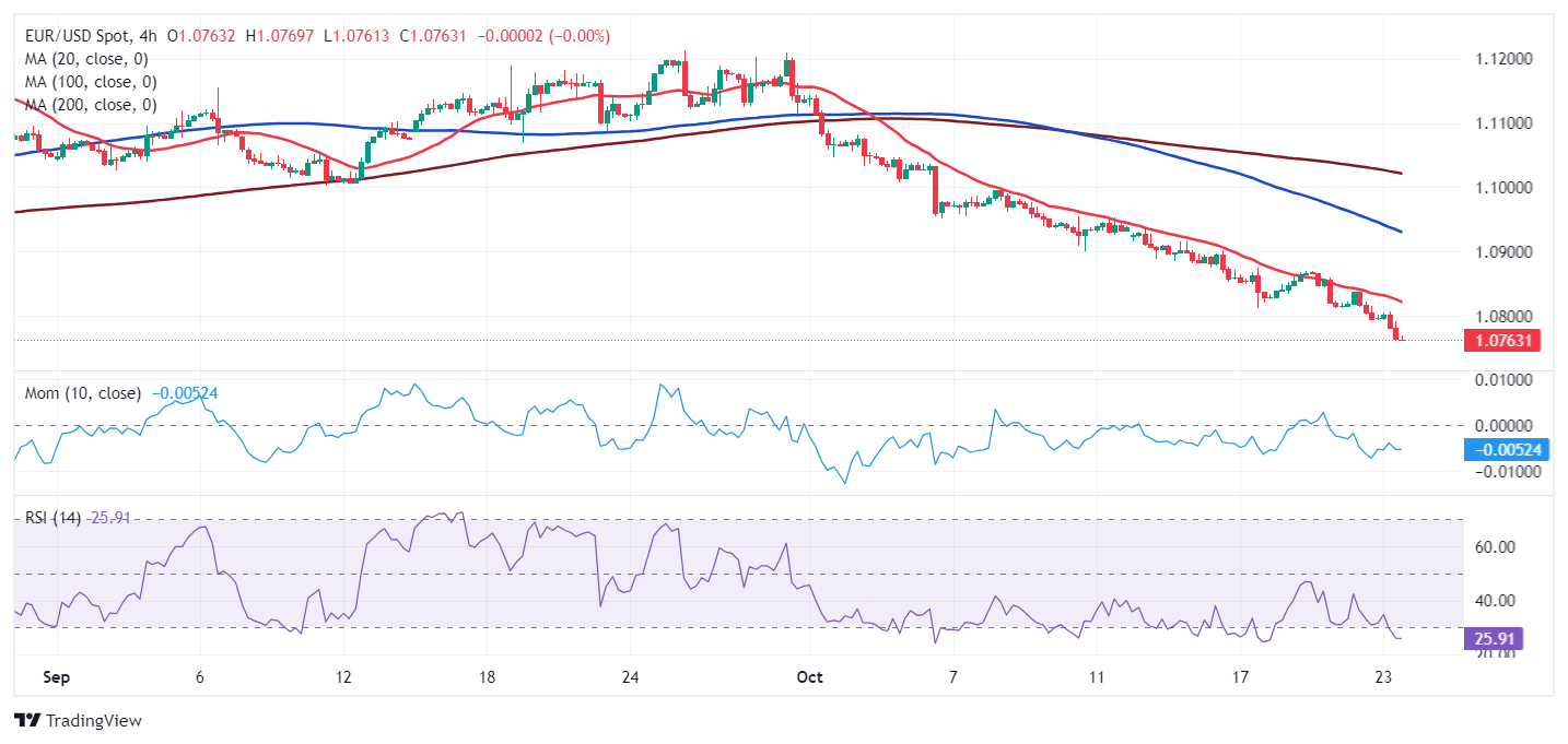 The EUR/USD pair extended its slide on Wednesday, trading near fresh multi-week lows in the 1.0770 region in the mid-European session. On the one hand, the US Dollar keeps rallying amid a dismal market mood and concerns about the outcome of the upcoming United States (US) Presidential election. On the other hand, the Euro suffers from poor local macroeconomic data that suggests the economic setback continues in the final quarter of the year.