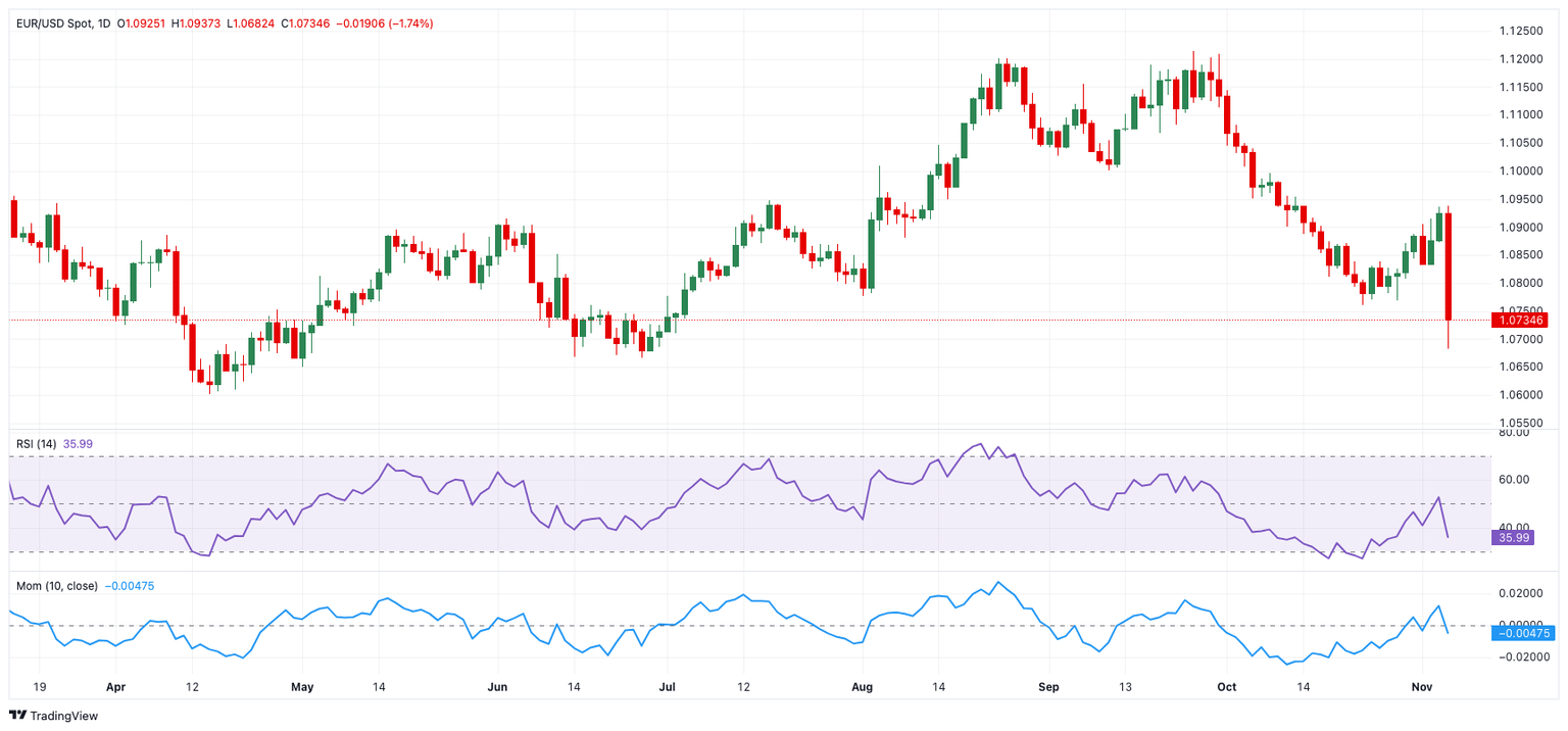 - EUR/USD plummeted to five-month lows near 1.0680 post-US election.