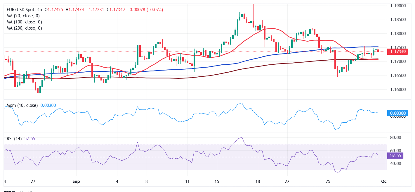 Financial markets keep revolving around a potential United States (US) government shutdown on Tuesday, after headlines indicating Congress representatives failed to clinch a deal on federal funding late on Monday, with Senate Democratic Leader Chuck Schumer noting that the two sides still have "very large differences." The EUR/USD pair peaked at 1.1761 during European trading hours, easing towards the current 1.1730 price zone ahead of the US opening.