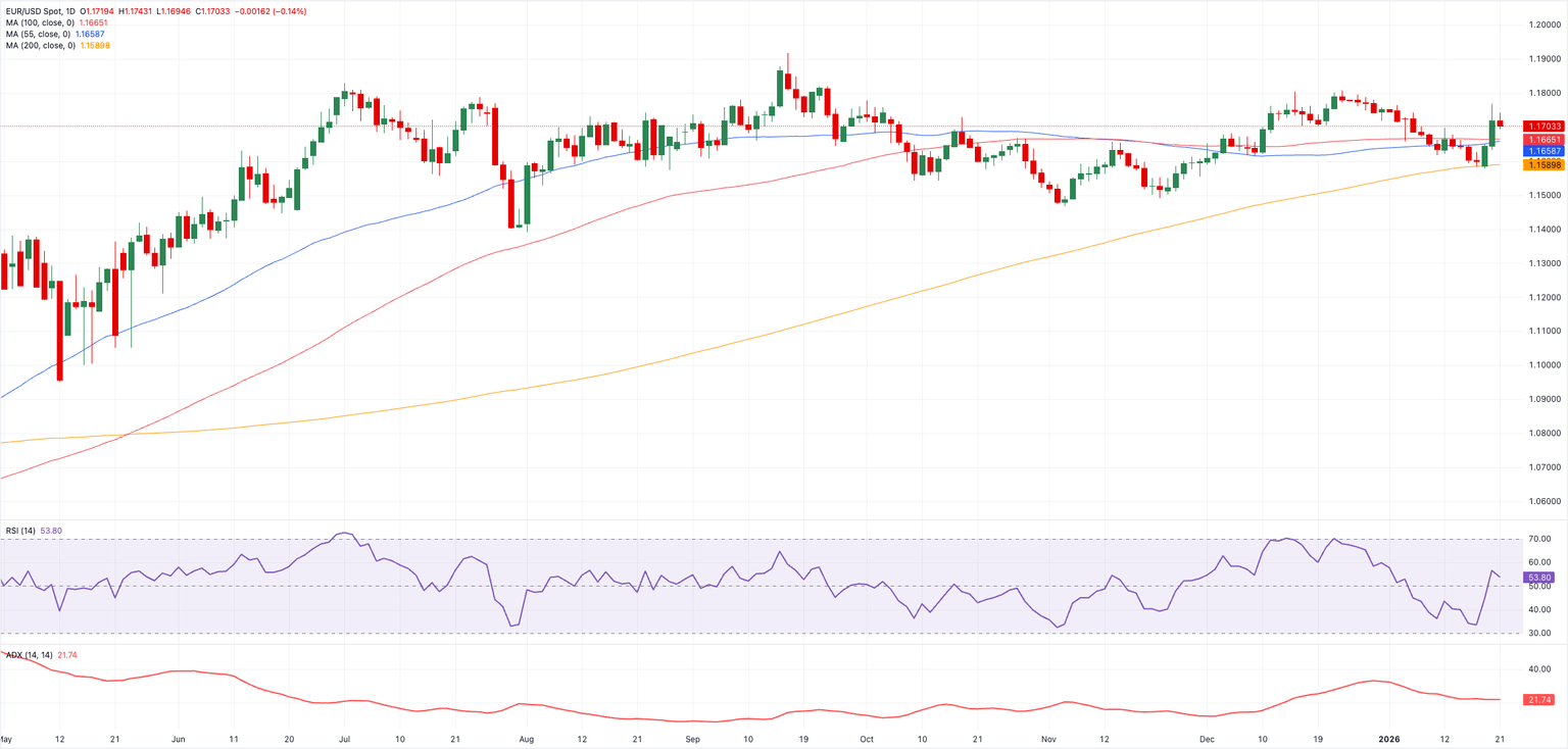 EUR/USD is losing momentum on Wednesday, hovering just below the 1.1700 mark as volatility across the FX space remains muted. The pair’s gentle pullback reflects a modest bounce in the US Dollar (USD), with markets still chewing over President Trump’s remarks at the World Economic Forum in Davos.