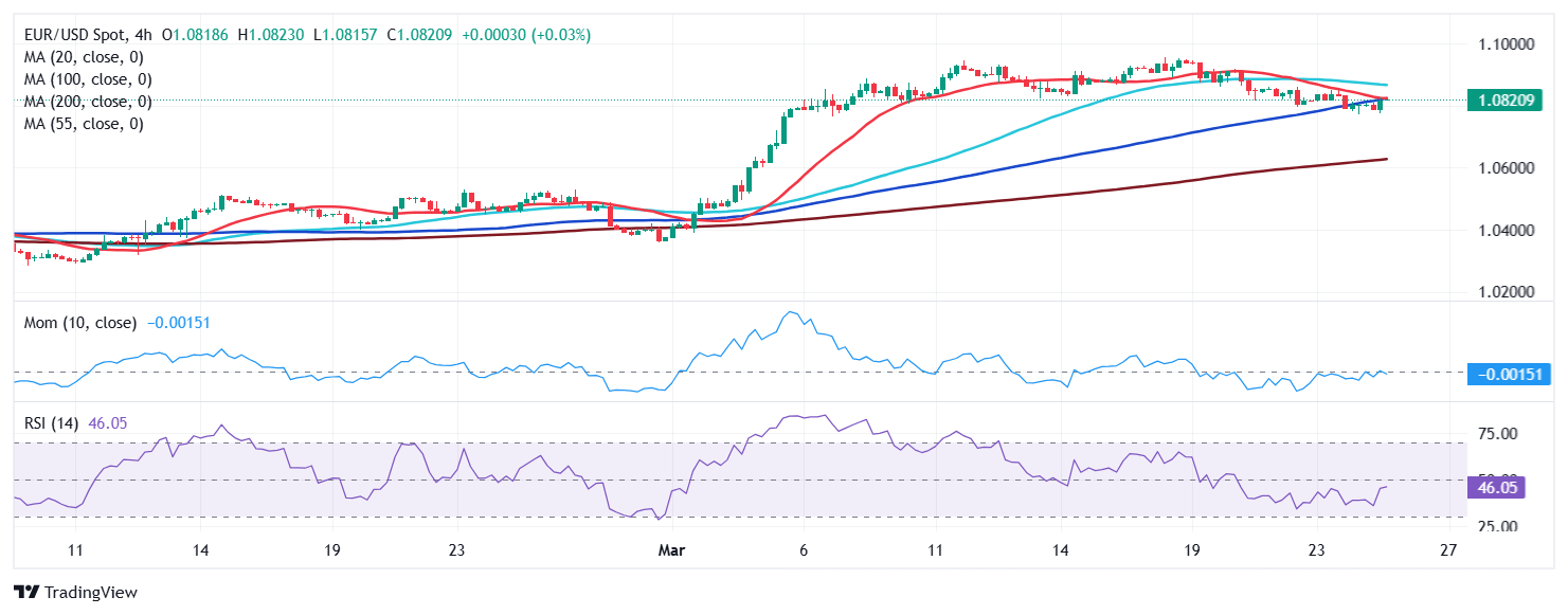 The EUR/USD pair trades with a soft tone for the fifth consecutive day, extending its slide to 1.0776, the lowest since March 6. However, broad US Dollar (USD) weakness mid-European session sent the pair into positive territory.