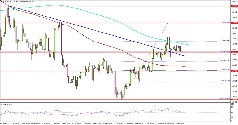 Looking at the 4-hour chart, the pair traded above a major bearish trend line with resistance at 1.0815. There was a move above the 1.0850 level, but the bears faced resistance near the 1.0885 level. A high was formed near 1.0888 and the pair is now well above the 100 simple moving average (red, 4-hour).