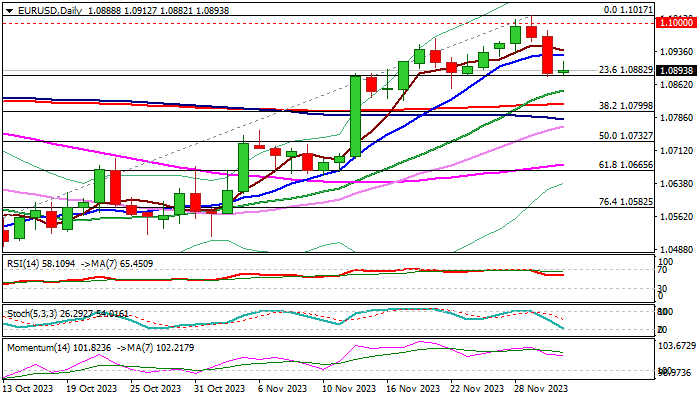 Two-day pullback after a double failure at psychological 1.10 barrier, found temporary footstep on Fibo support at 1.0882 (23.6% retracement of 1.0448/1.1017 rally).