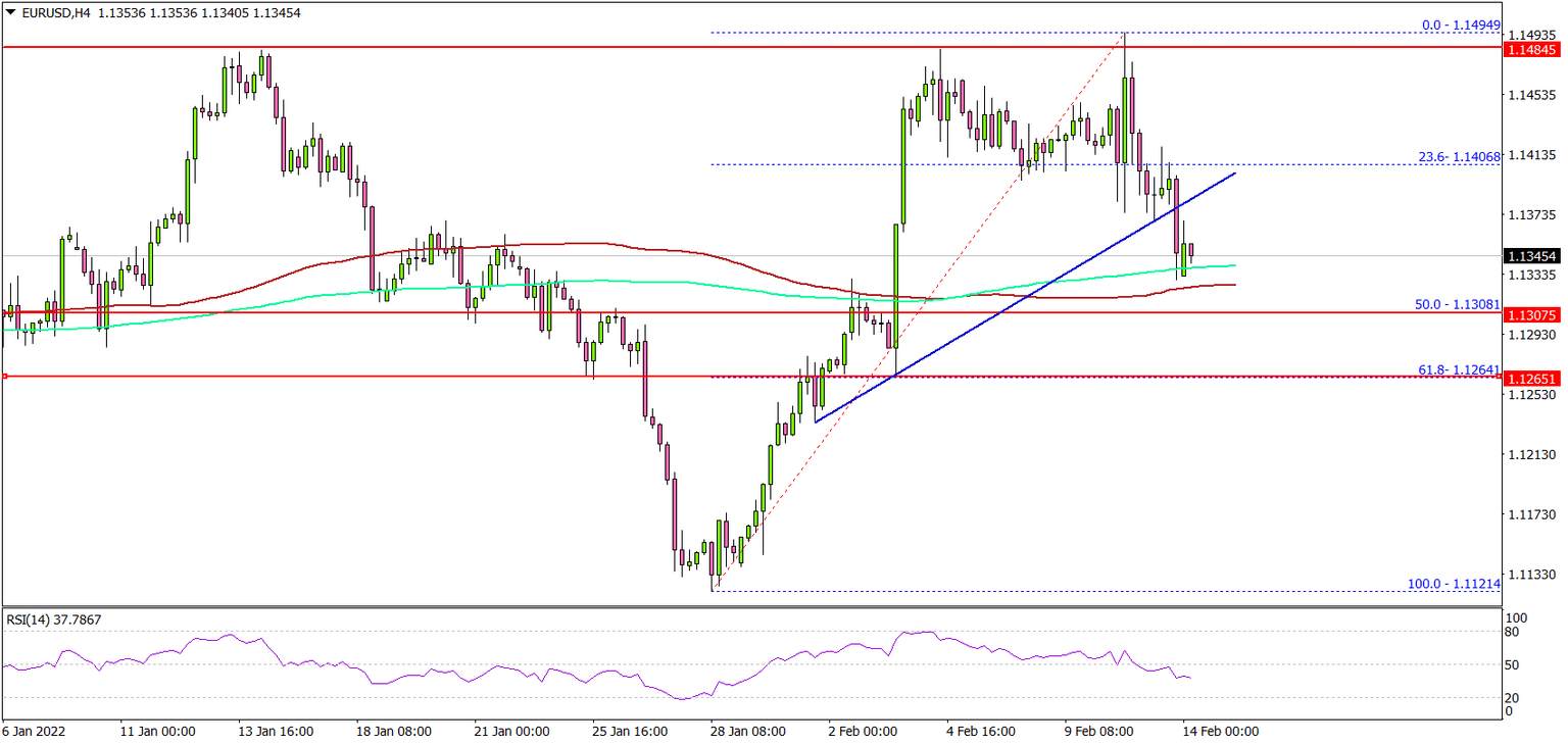 Looking at the 4-hours chart, the pair started a downside correction below the 1.1450 level. The pair spiked below the 38.2% Fib retracement level of the upward move from the 1.1124 swing low to 1.1494 high.