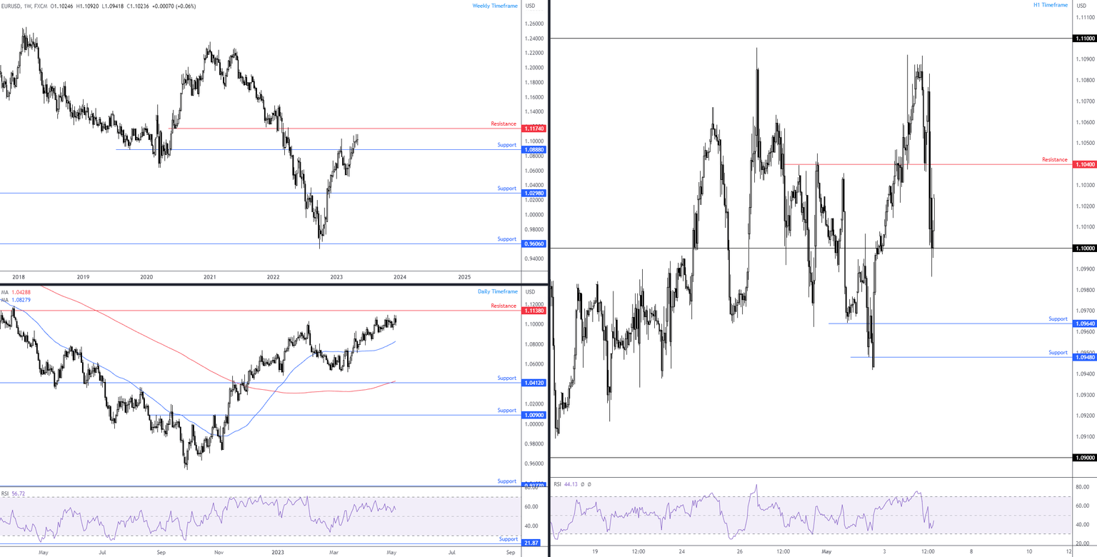 The EUR/USD aggressively explored lower levels following the rate announcement. Leaving the underside of $1.11 unchallenged, downside pressure led H1 price action into a floor of bids around the $1.10 psychological figure. I am sure most would agree that the H1 chart is a bit of a mess; although we are rebounding from $1.10, the trend is not greatly defined in the short term (longer term, it is clear we have been heading higher since September 2022). H1 resistance is at $1.1040, with a break of here perhaps approaching the $1.11ish neighbourhood.
