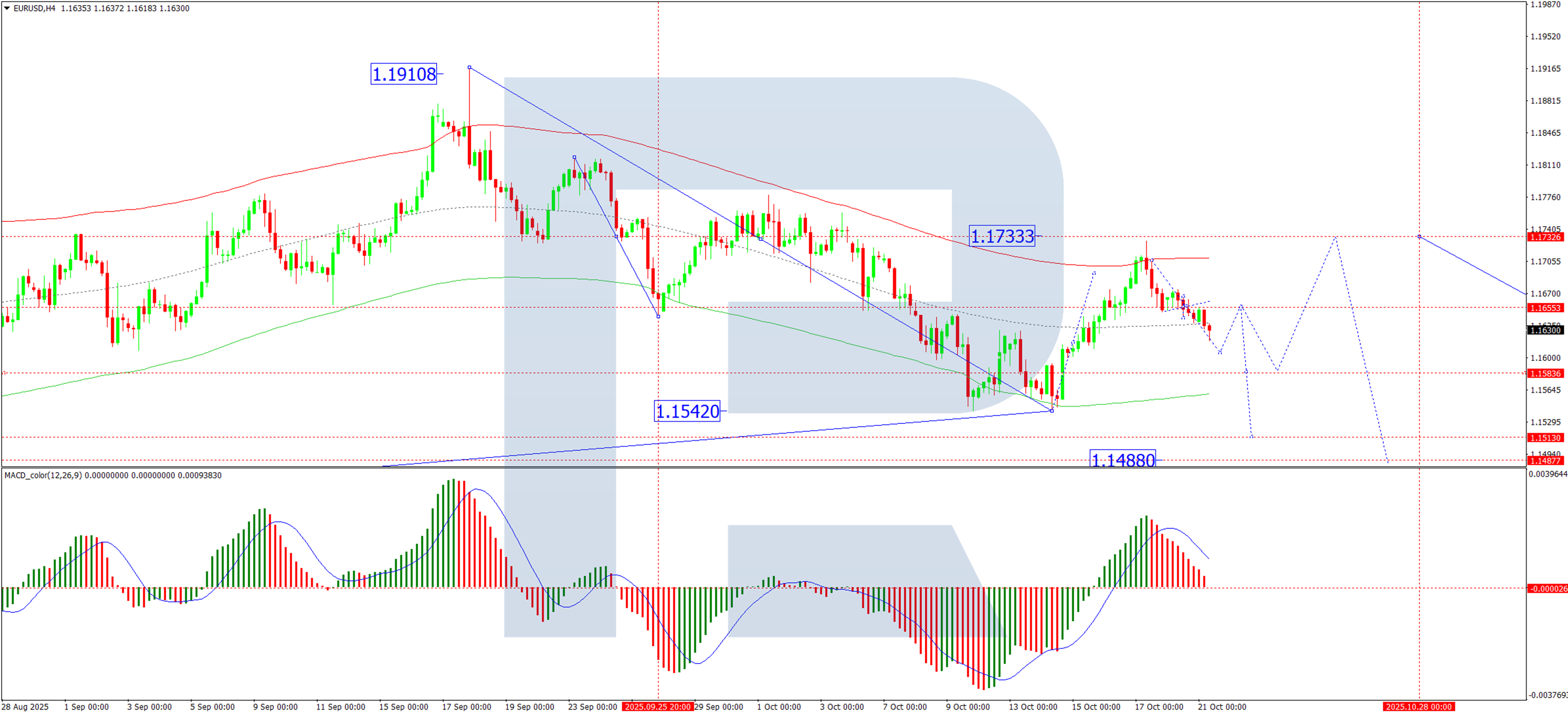 On the H4 chart, EUR/USD has been forming a broad consolidation range around the 1.1656 level. The pair is currently trading below this pivot, with initial bearish targets at 1.1606 and 1.1568. A retest of the range’s upper boundary towards 1.1733 remains a possibility. However, a decisive break below the current consolidation would open the potential for a deeper decline towards 1.1488, with a subsequent extension to 1.1400. This bearish technical picture is confirmed by the MACD indicator, whose signal line, while above zero, is pointing decisively downwards, indicating that bearish momentum is prevailing.