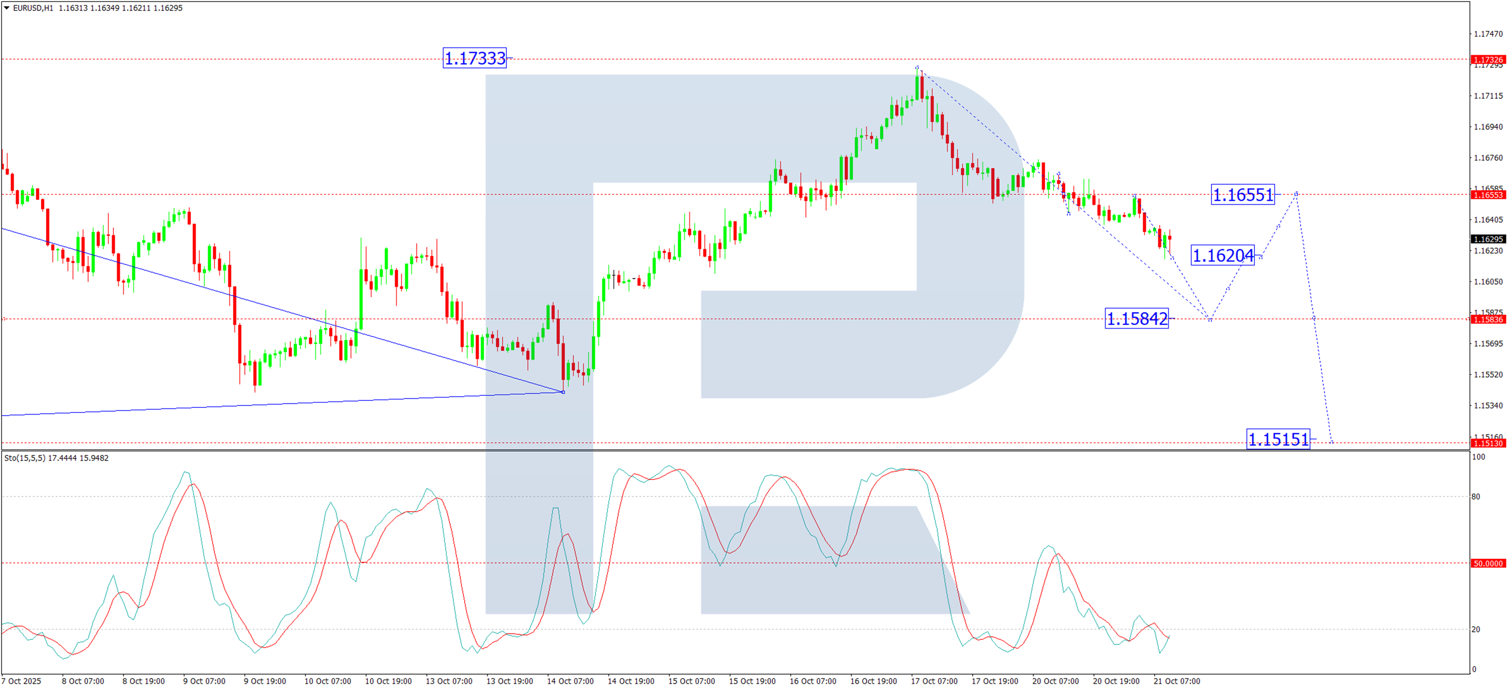 The H1 chart shows the pair breaking downwards from a tight consolidation around 1.1655. This move signals the likely completion of a corrective phase and the start of a fresh leg lower. The initial downside target is at least 1.1584. This view is supported by the Stochastic oscillator, whose signal line is below 50 and is holding near the 20 level, reflecting strong near-term bearish momentum.