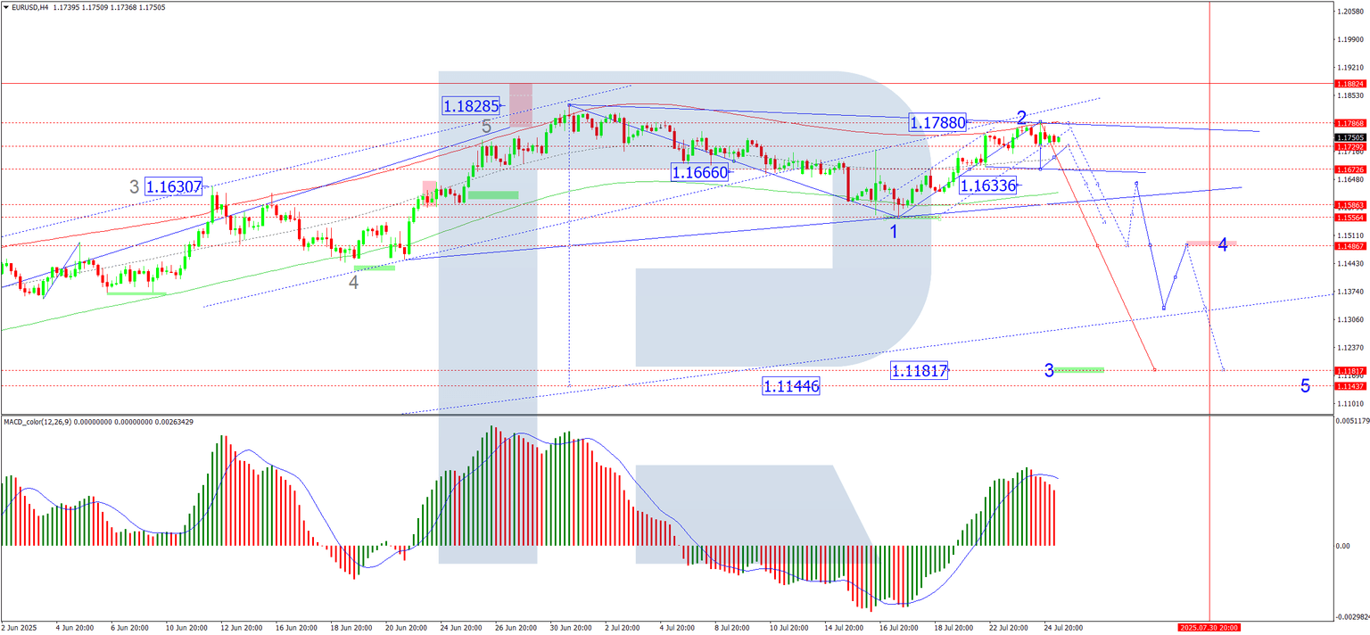 The EUR/USD has completed an upward wave towards 1.1788 on the H4 chart. Today, we expect a downward impulse to 1.1723, followed by a potential rebound to 1.1755. The pair is likely to enter a consolidation range near the peak of this upward wave, with a possible breakout to the downside towards 1.1670 as the primary target. This scenario is supported by the MACD indicator, where the signal line remains above zero but is trending sharply downward.