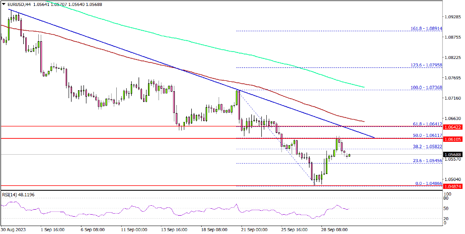 A low was formed near 1.0486 and the pair recently started an upside correction. There was a move above the 1.0550 level. The pair tested the 50% Fib retracement level of the downward move from the 1.0736 swing high to the 1.0486 low.