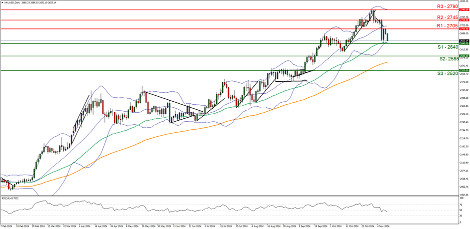 Gold’s price appears to be moving in a downwards fashion. We opt for a bearish outlook for the precious metal’s price and supporting our case is the RSI indicator below our chart which currently registers a figure near 40, implying a bearish market sentiment. For our bearish outlook to continue, we would require a clear break below the 2640 (S1) support level, with the next possible target for the bears being the 2585 (S2) support line. On the flip side, for a sideways bias, we would require the precious metal’s price to remain confined between the 2640 (S1) support level and the 2705 (R1) resistance line. Lastly, for a bullish outlook we would require a clear break above the 2705 (R1) resistance line with the next possible target for the bulls being the 2745 (R2) resistance level.