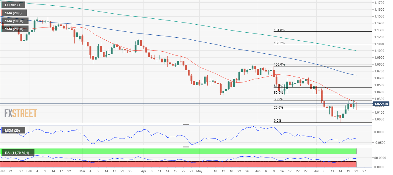 The EUR/USD pair is ending the week in the 1.0220 price zone, extending the recovery from the multi-year low of 0.9951, hit in mid-July. The pair got to bounce on Friday, although the advance had little to do with the shared currency, but more with the outstanding Wall Street’s weekly performance and falling US government bond yields taking their toll on the greenback. US stocks were backed by better-than-anticipated earnings reports alongside hopes the Federal Reserve will refrain from tightening monetary policy at a faster-than-anticipated pace.