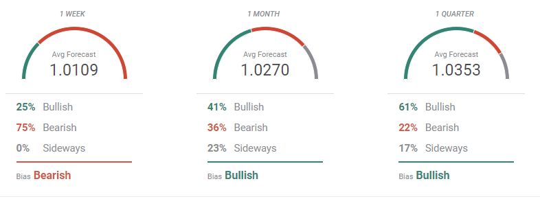 According to the FXStreet Forecast Poll, EUR/USD is close to confirming an interim bottom. Most polled experts see the pair below the current level in the upcoming week, but bulls take over in the monthly and quarterly views. The pair is seen averaging 1.0100 in the near term but recovering towards 1.0300 in the wider views.