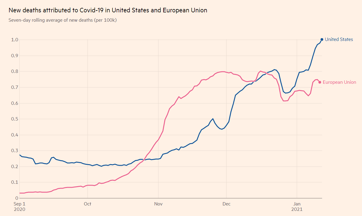 However, while the disease is taking its toll, there is a yawning gap in the vaccination pace. European countries have barely inoculated 1% of the population while America has surpassed the 3% mark and is accelerating its pace. The growing gap also weighs on EUR/USD.