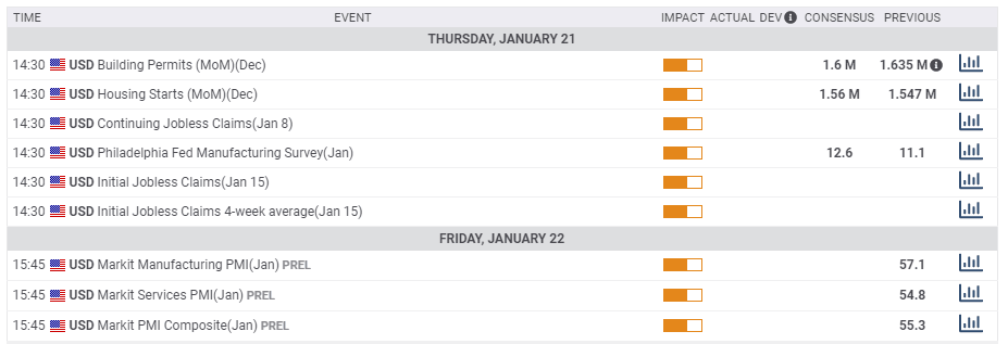The US economic calendar is relatively light. Weekly jobless claims for the week ending January 15 may provide a sneak peek toward the Nonfarm Payrolls report, and Markit's preliminary Purchasing Managers' Indexes are also of interest.